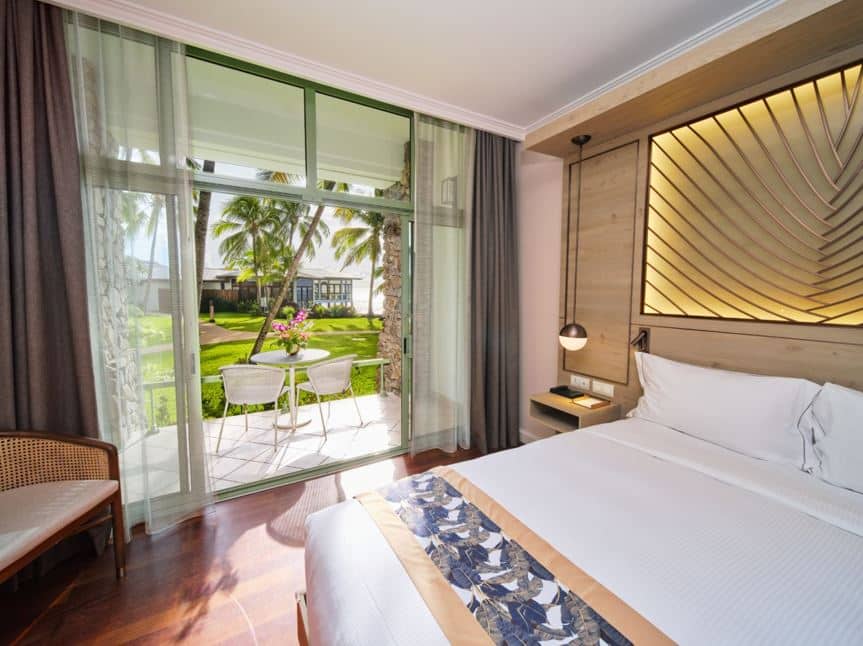 Enjoy your stay in this guestroom beautifully decorated with island-inspired artwork including a spacious seating area and ocean view.
