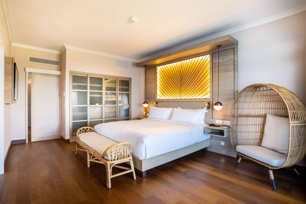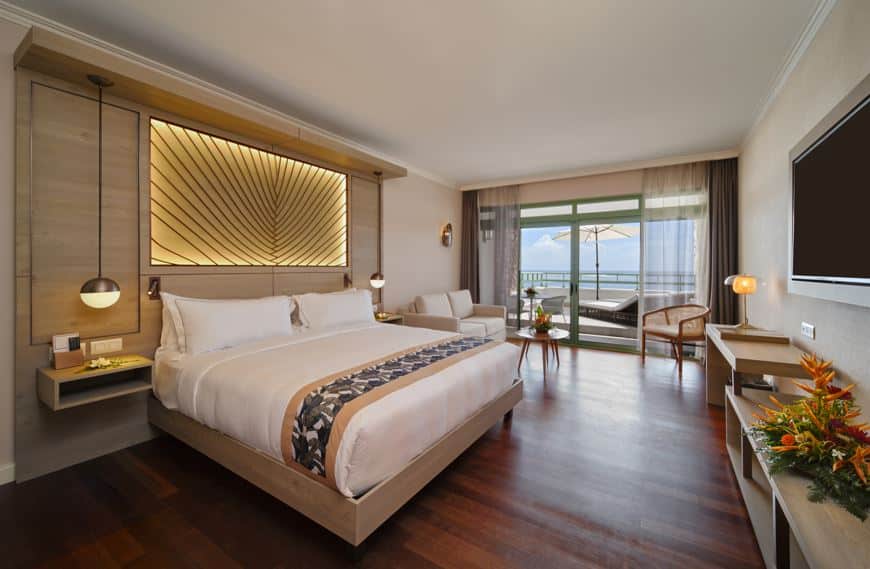 Enjoy your stay in this guestroom beautifully decorated with island-inspired artwork including a spacious seating area and ocean view.