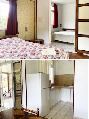 It is located at the end of the garden, set back from the other bungalows. The only one with 2 bedrooms & air conditioning. It has a fully-equipped kitchen (fridge, gas stove, utensils), a living room, a bathroom with shower and hot water, and a covered terrace with deckchair. The whole is functional, clean and simply decorated with a Polynesian feel. It can accommodate up to 5 adults. Ideal for families or groups of friends.