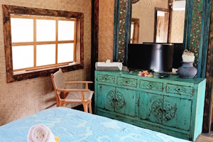 This unit, ideal for up to three people, comprises a master bedroom with a spacious bed, TV, storage space including a bedside table, and air conditioning and fan for optimum comfort. The main bathroom and toilet are located under a separate roof, offering privacy and convenience. A second air-conditioned bedroom has its own bathroom and a large double bed.