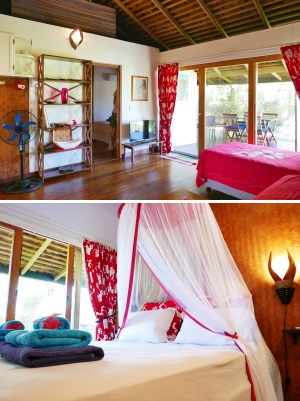 Nestled in the greenery of Poerani Moorea's tropical garden, the Mata'i ("wind") suite combines modern comfort with Polynesian tradition. Built in wood, this suite has a bedroom with air conditioning* and safe, a bathroom with Italian shower and toilet, a large living room with twin beds and a fully equipped kitchen. All linen (sheets, pillowcases, towels, shower and beach towels, dish towels) is provided. You can relax and enjoy your meals on the large covered deck.