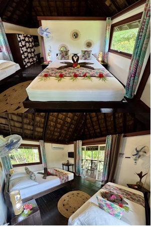 All the bungalows of the pension are located in a beautiful garden. Furnished in coconut wood, they are well equipped, with private toilets, bathroom with hot water (solar), television, fan, a small refrigerator and a beautiful sheltered terrace. The "small" bungalows are, as their name indicates, the smallest bungalows that can accommodate 3 people, including a comfortable bedding set.