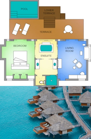 Ideal for honeymooners seeking a romantic “suite life” experience. A spacious living room opens to a deck, while the bedroom has access to a private, fresh-water plunge pool with unobstructed views on the lagoon.