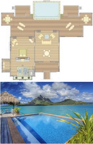 Overwater Royal Otemanu Villa, sold with only 1 bedroom and the lounge making it ideal for a couple. The villa features a large swimming pool of 6m x 5m and two gazebos.