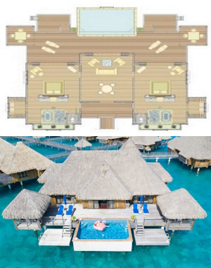 These magnficent villas feature two identical bedrooms with bathroom, separated by a lounge overlooking the main island and Mount Otemanu. Facilities are identical to its little sister the Overwater Premier Otemanu Villa & Whirpool, with an additional gazebo and the largest swimming pool suspended over the lagoon in the South Pacific… 6m x 4m!