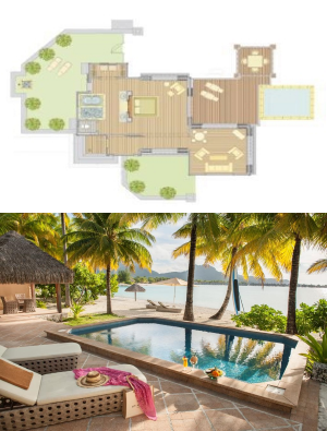 These units are located on the beach surrounded by palm trees, they have the same indoor configuration as the Overwater Superior Villas. The bathroom opens onto a walled garden with outdoor shower. A large terrace with a gazebo and a plunge pool 4m x 3m overlooking the beautiful lagoon of Bora Bora complete this elegant villa.