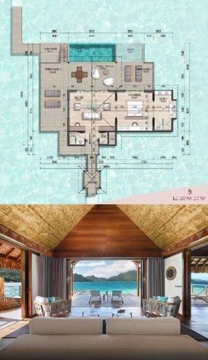 This category combines a Polynesian decoration with wooden floors, pandanus roof, carved woodwork, large outdoor spaces and modern comfort with Smart TV, air conditioning, connectors and USB sockets and mini bar. It has a bedroom with private bathroom and a separate living room with en-suite bathroom, a private deck with hanging net on the lagoon of Bora Bora and an infinity pool.
