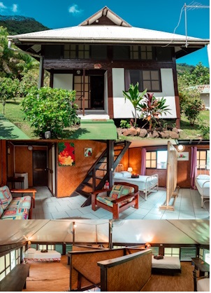 The Aute bungalow, the largest at the pension, can accommodate up to 10 guests across two floors. It features comfortable bedding and is furnished with coconut wood. Ideal for families or a stay with friends, it includes a bathroom with toilet and solar hot water, a living area, a desk, a wardrobe, a television, a fan, mosquito nets, a mini-refrigerator, and a covered terrace with outdoor seating.