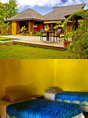 Villas HINANO & FARA are adjoined units. As all villas, they are located lagoon side and feature a private pool. Designed in a style that combines wood and stone with colorful decoration, they are modern, comfortable and will perfectly suit a family of 4 or a party of friends with 1 double bedroom, 1 bedroom with twin beds, 2 bathrooms and a fully equipped kitchen. Enjoy the large terrace and garden with lagoon access for a kayak ride.