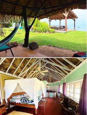This small oval “fare”, adorned with painted frescoes on the outside and bamboo decoration on the inside, stands out for its originality. It's ideal for honeymooners. The unit includes a private bathroom, a fully equipped kitchenette, a living room and a private furnished and covered terrace.