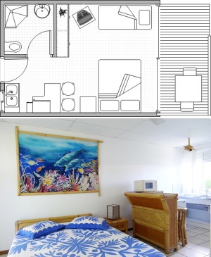 The studios are all equipped with a kitchenette including: a small refrigerator, induction cooker, a microwave oven, a bar with stools, an assortment of dishes and pots. As all other categories, they feature a small terrace of 8m² with a table and chairs offering the possibility to have meals outside. Ideal for small families.