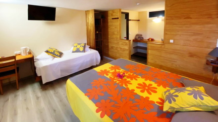 Just a 15-minute drive from Vaitape and 300 meters from the Bora Bora Yacht Club and the Bora Bora Beach Club, the Bora Bora Holidays Lodge guesthouse welcomes you in a peaceful setting with breathtaking views of the lagoon. Nestled on an 8,000 m² mountainside, this establishment combines charm, comfort and serenity in the heart of a wooded and flowery estate. Ideal for a stay as a couple or family, it is a comfortable alternative to the island's hotels, offering a friendly atmosphere and a secure environment. Enjoy the large swimming pool and the fare pote'e, or go hiking from the guesthouse to explore the remains of the Second World War cannons, an easily accessible site with a spectacular view of the lagoon.