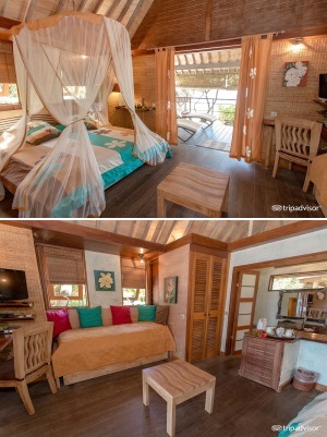 Each bungalow has a covered terrace. Quality bedding ensures comfortable nights. The bathroom, with a particularly well-designed decor, is equipped with a shower made of Moorea stones, polished stone basins, bathrobes and a hair dryer.