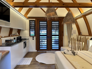 These bungalows are perfect for a couple or small party of 3 with its double bed and sofa bed, smart TV, kitchenette and furnished terrace. Enjoy the seaview and sunbeds in front of your bungalow.