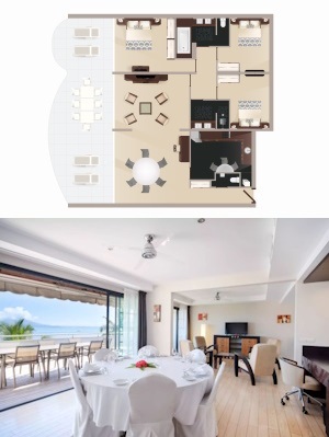 This is the hotel's largest, three-bedroom Polynesian-style apartment, featuring a spacious living room, fully-equipped kitchen, bathroom and separate toilet. Its terrace offers a magnificent view of the lagoon and the island of Moorea in the background. This space is ideal for vacations with family or friends in Tahiti.