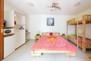 The family studio with kitchenette is nicely equipped with bamboo furniture.