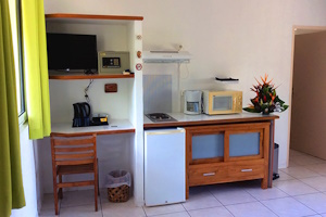 The studios with kitchenette are also nicely equipped with bamboo furniture. They have views of the guesthouse garden. They include a kitchenette for the preparation of meals (hotplates, microwave, coffee maker, basic utensils and cutlery).